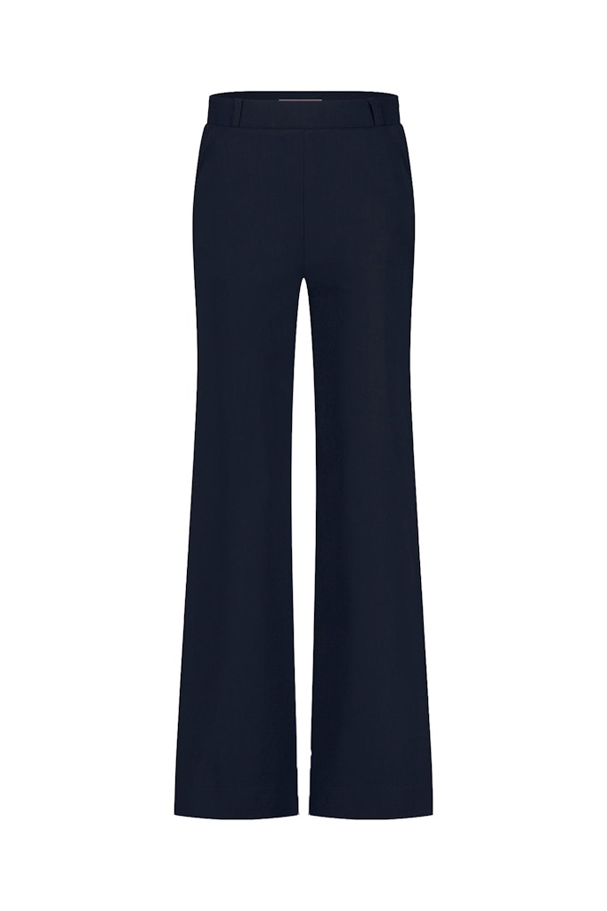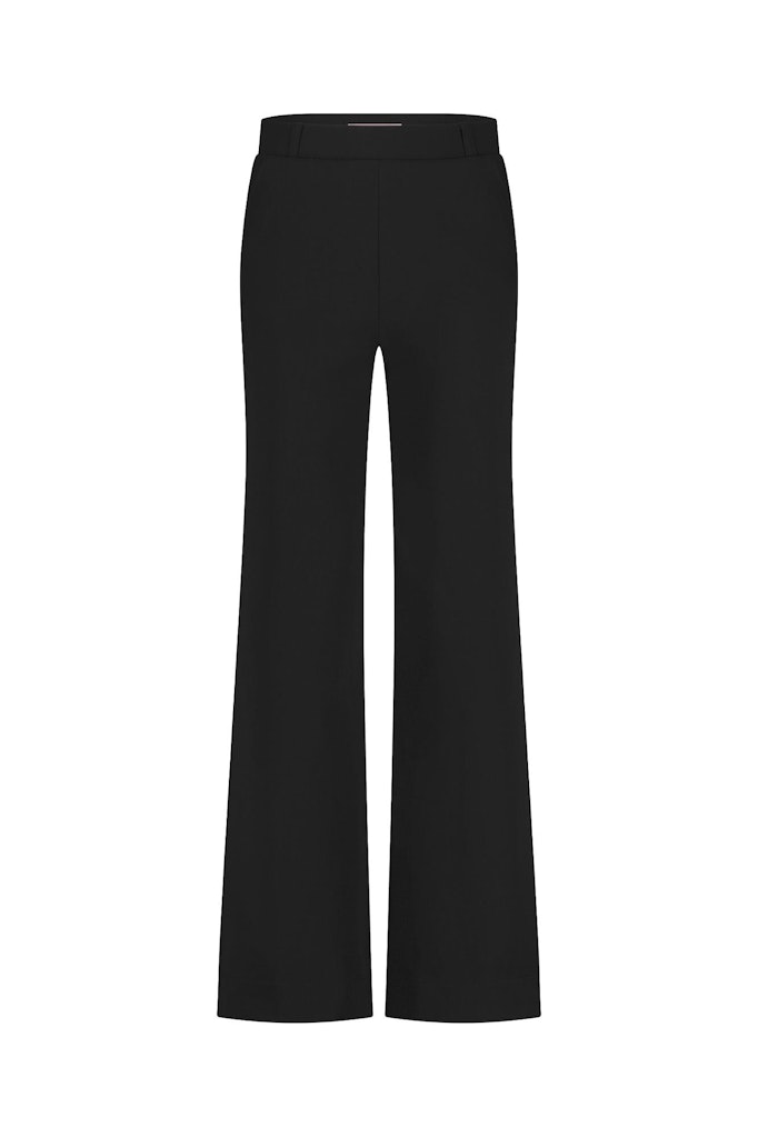 Broek van Studio Anneloes in travel kwaliteit met wijde pijpen, hoge taille, elastische tailleband, riemlussen, steekzakken en paspelzakken aan de achterzijde.