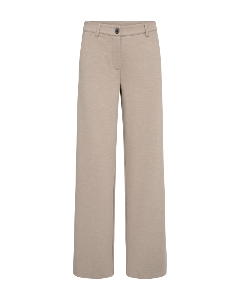 Broek van Freequent met rechte pijpen, knoop- en ritssluiting, steekzakken en paspelzakken aan de achterzijde. Materiaal: Polyester 73%| viscose 24%| elastan 3%