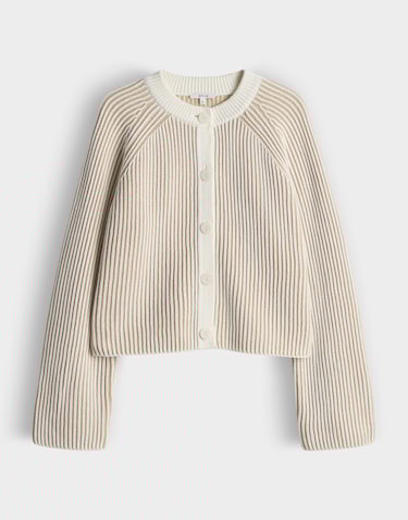 Tweekleurig gebreid vest van Opus in een streeppatroon met lange raglanmouwen, knoopsluiting en een ronde hals.