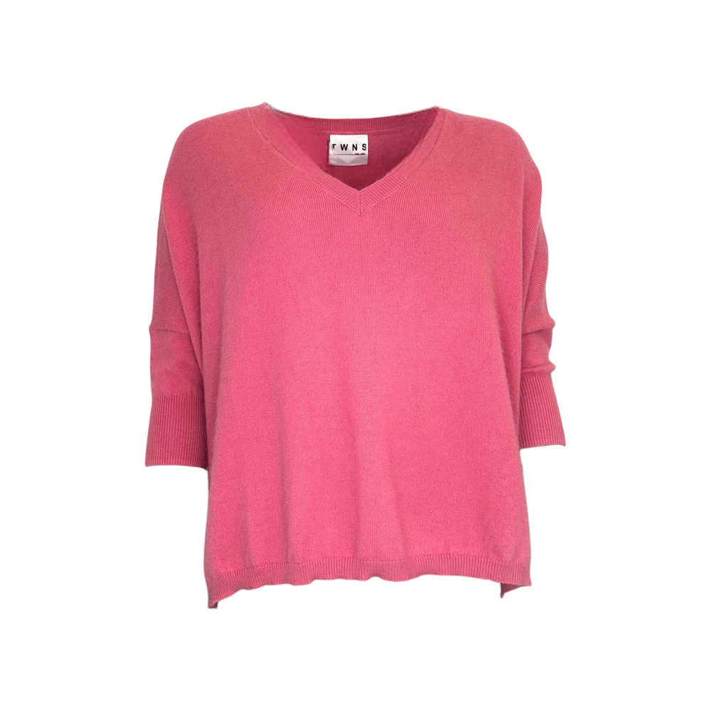 Trui van Twins the Label met driekwart mouwen, verlaagde schoudernaden, V-hals, split in de zijnaad en ribboorden.