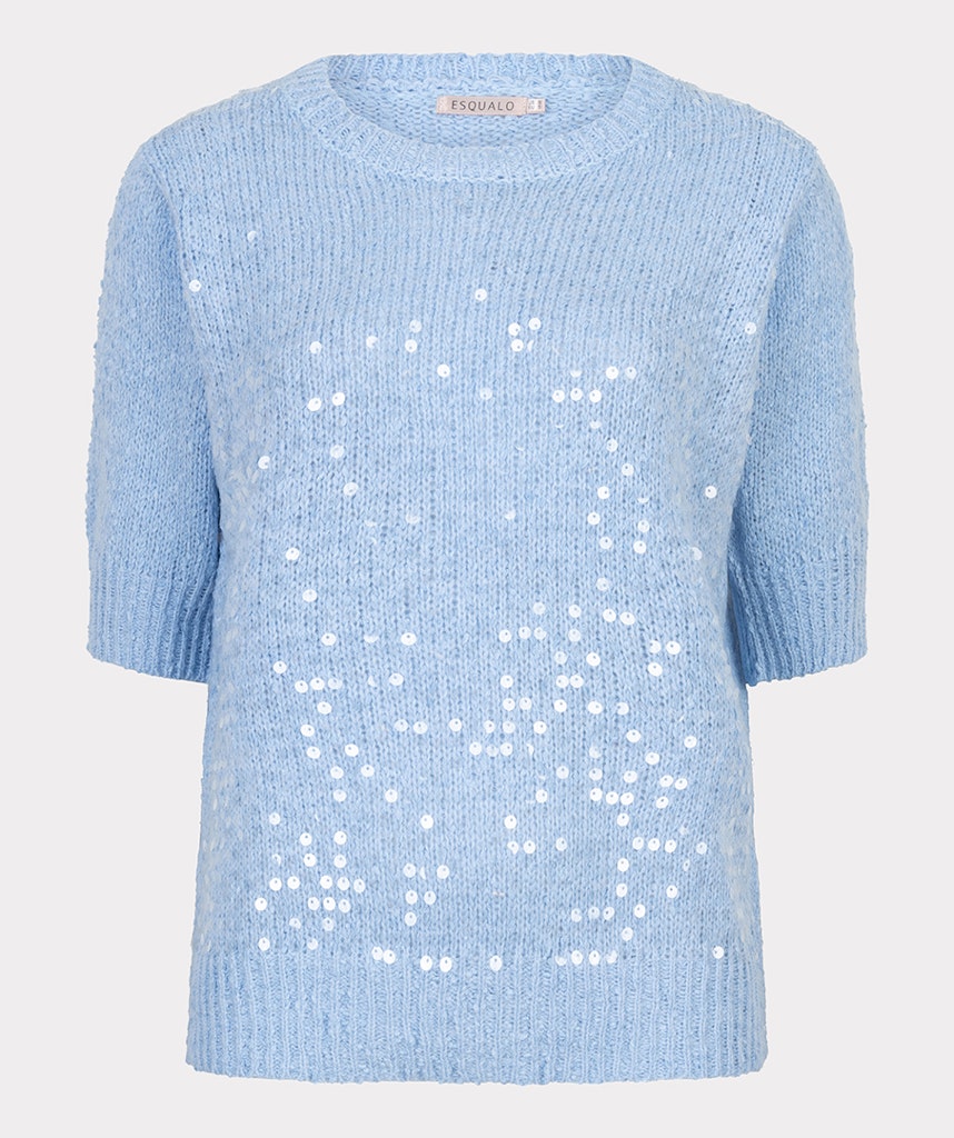 Trui van Esqualo voorzien van pailletten aan de voorzijde met korte mouwen, ronde hals en ribgebreide boorden.