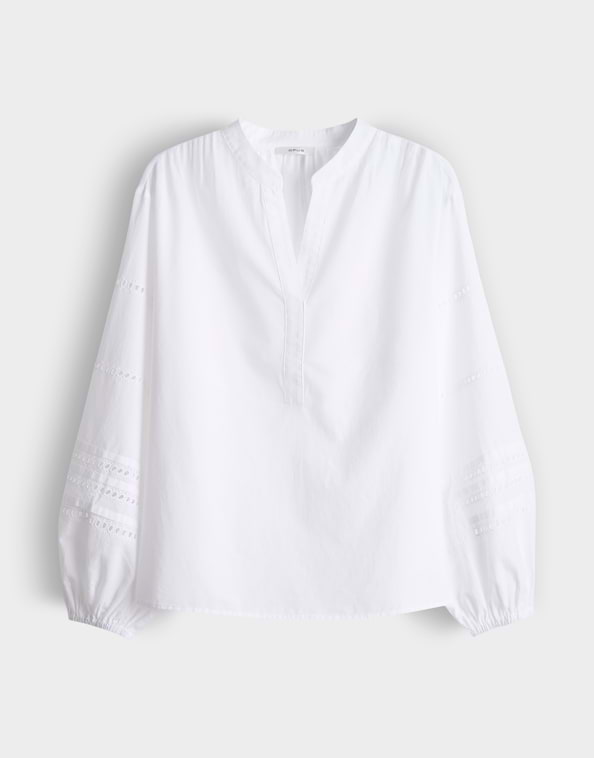 Blouse van Opus met lange pofmouwen voorzien van broderie details, verlaagde schoudernaden, opstaande kraag en een V-hals. Materiaal: Katoen 100%