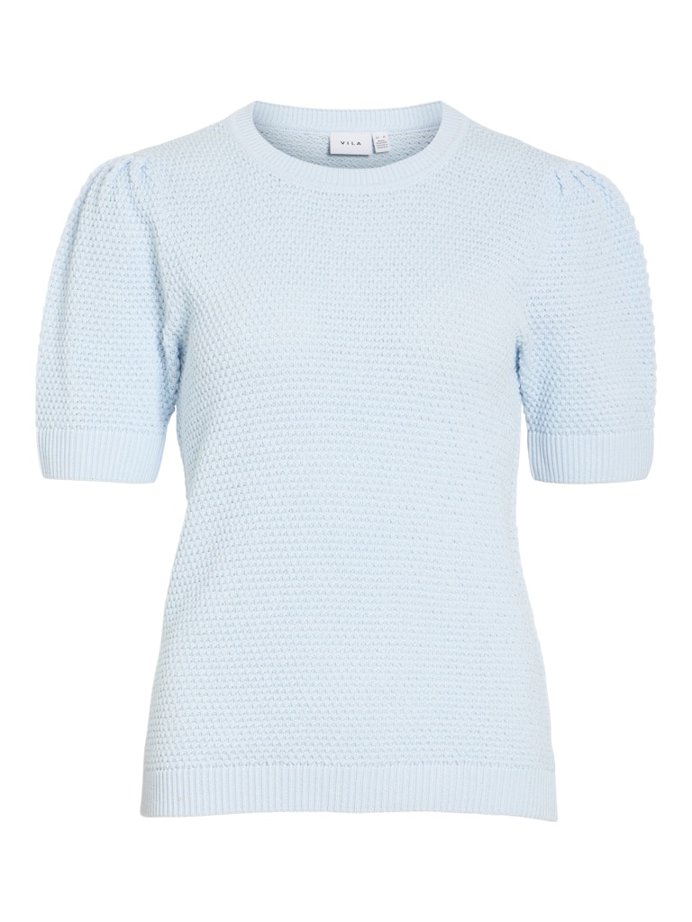 Gebreide top van Vila in een strutuur dessin met korte pofmouwen, ronde hals en ribgebreide boorden. Materiaal: Biologisch katoen 50%| katoen 50%