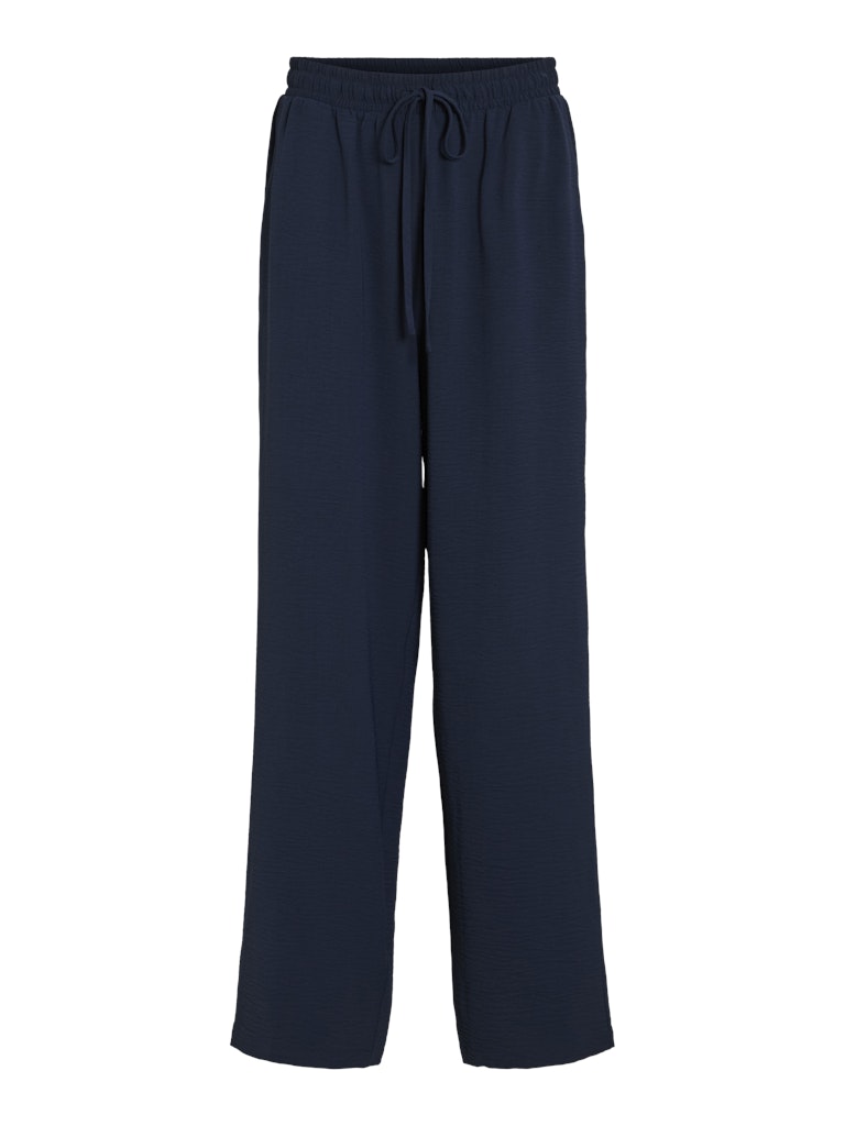 Broek van Vila in een subtiel structuur met wijde pijpen, steekzakken en een elastische tailleband voorzien van trekkoord. Materiaal: Gerecycled polyester 100%