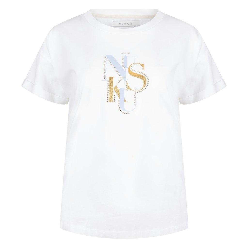 T-shirt van Nukus met korte mouwen, ronde hals en eeen glimmende logoprint op de borst. Materiaal: Katoen 100%