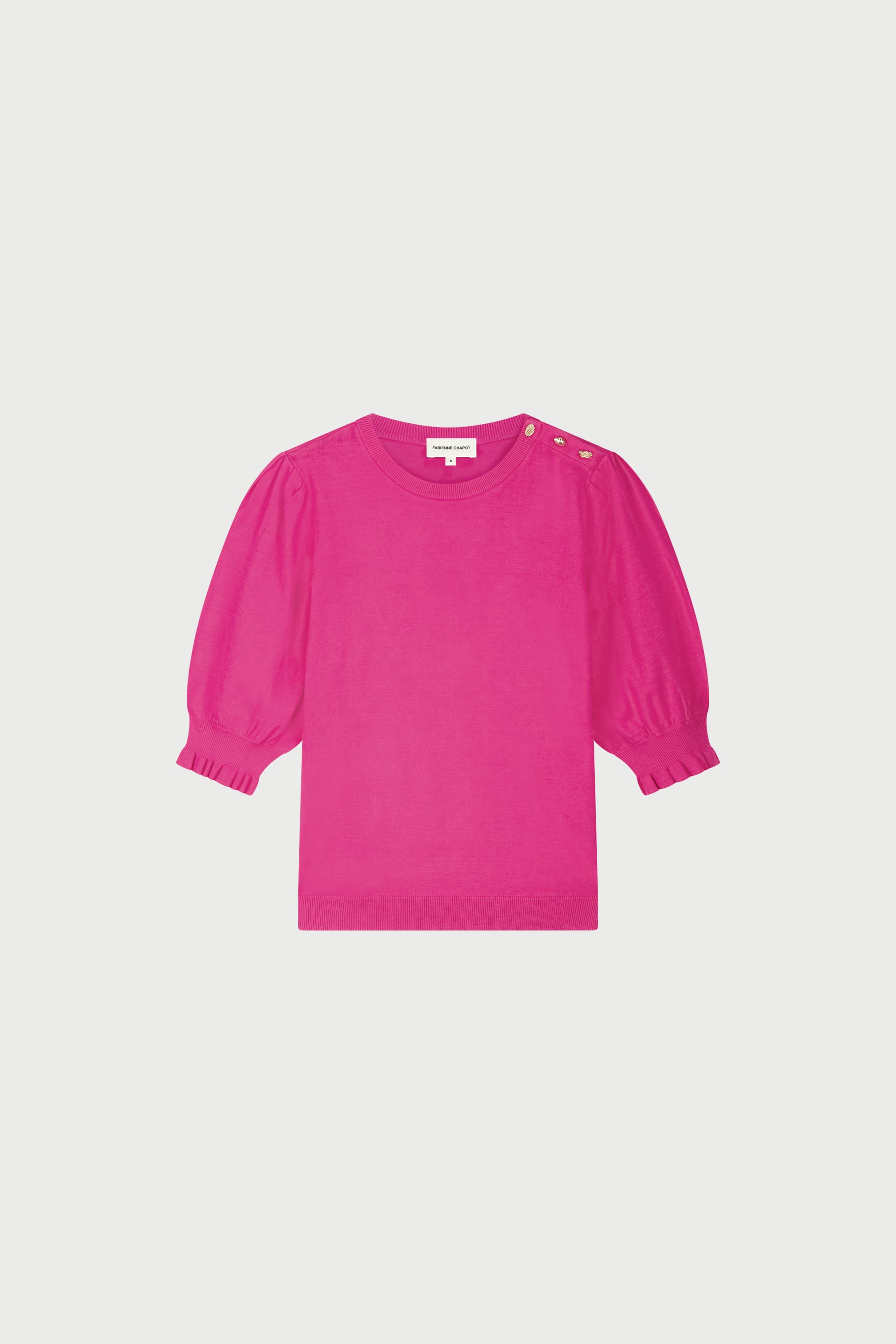 Trui van Fabienne Chapot met halflange pofmouwen voorzien van gesmokte manchetten, ronde hals en een knopendetail op de linkerschouder.
