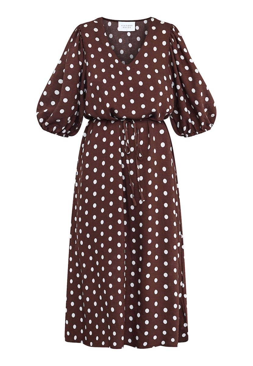 Midi-jurk van Sisters Point in een stippen dessin met driekwart pofmouwen, V-hals en een strikceintuur in de taille.