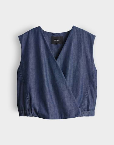 Mouwloze chambray denim gilet van Opus met een V-hals voorzien van overslag met een druksluiting in de elastische tailleband.