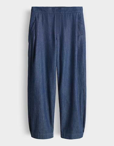 Enkellange chambray denim broek van Opus met wijde pijpen voorzien van drukknoop aan de zoom, steekzakken, bandplooien, een paspelzak en een elastische tailleband aan de achterzijde. Materiaal: Katoen 100%