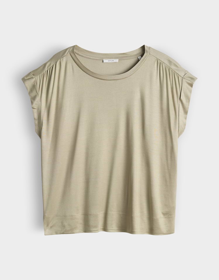 Soepelvallend shirt van Opus met een ronde hals, korte aangeknipte mouwen voorzien van omslag, rimpeldrtail aan de schouders en een korte split in de zijnaden.