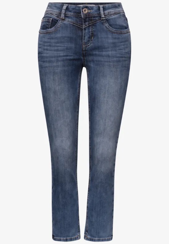 Enkellange slim legs jeans van Street One in een 5-pocket model met een knoop- en ritssluiting. Materiaal: Katoen 78%| polyester 21%| elastan 1%