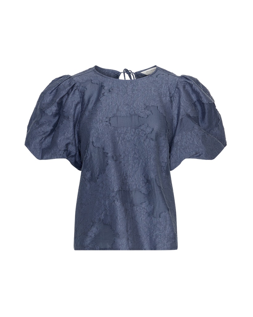 Glanzende blouse van Msch Copenhagen in een gestructureerde stof met korte pofmouwen, ronde hals en een keyhole voorzien van striksluiting aan de achtetzijde.