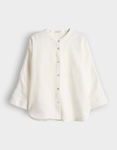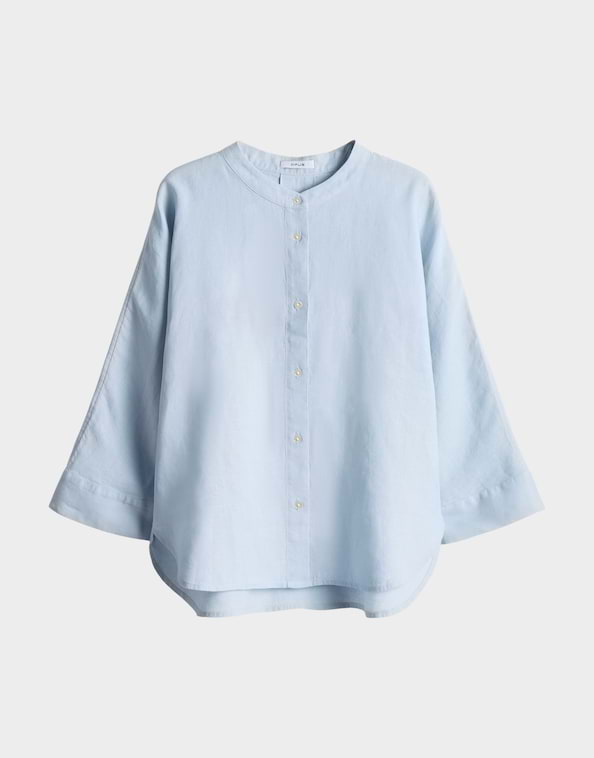 Linnen blouse van Opus met driekwart aangeknipte mouwen, opstaande kraag, knoopsluiting, rugplooi en een afgeronde zoom. Materiaal: Linnen 100%